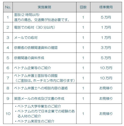 1.サービス概要に記載している内容でベトナムへの会社設立やM&Aなどプロジェクトで発注